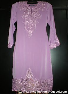 Ini adalah antara baju kurung yang telah disiapkan. Manik dijahit di bahagian leher dan hujung lengan.